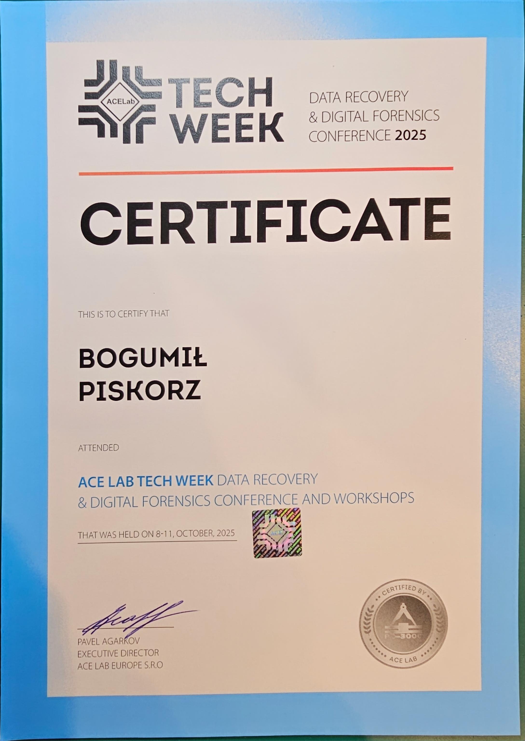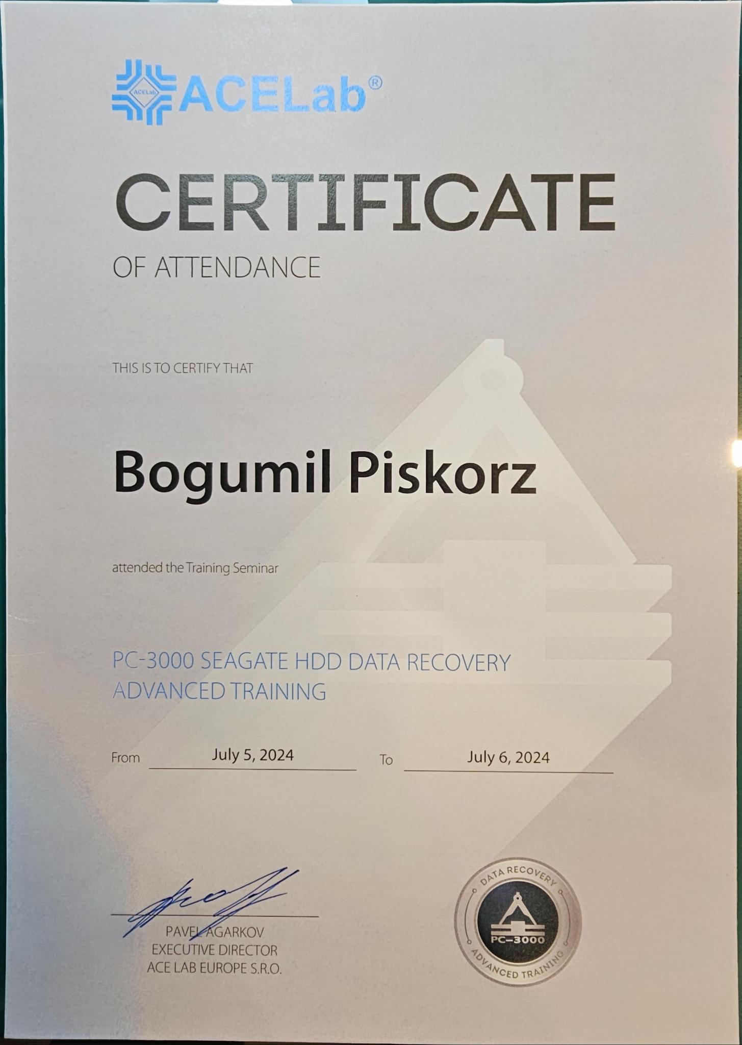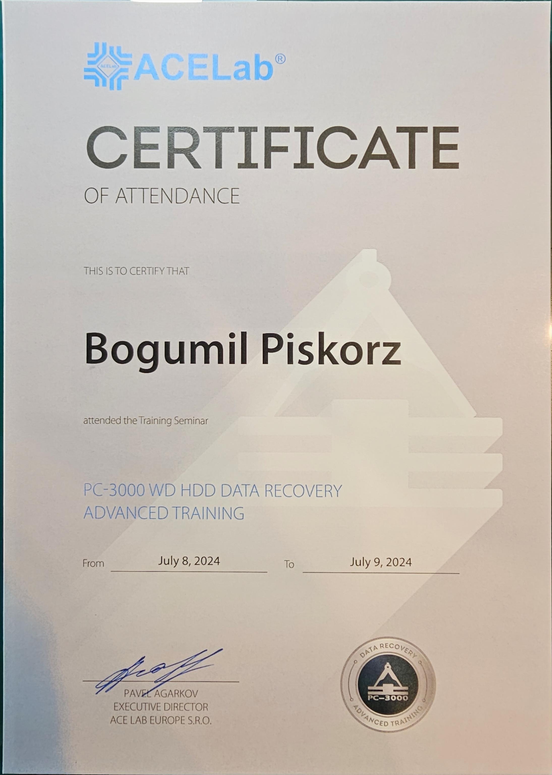 We sent him to get trained directly by the people who make the tools we use. ACELab makes the PC-3000; HEX Akademia in Poland specializes in diagnostics and foundational skills for drive repair. The courses below represent hands-on training with engineers who work on this full-time.
