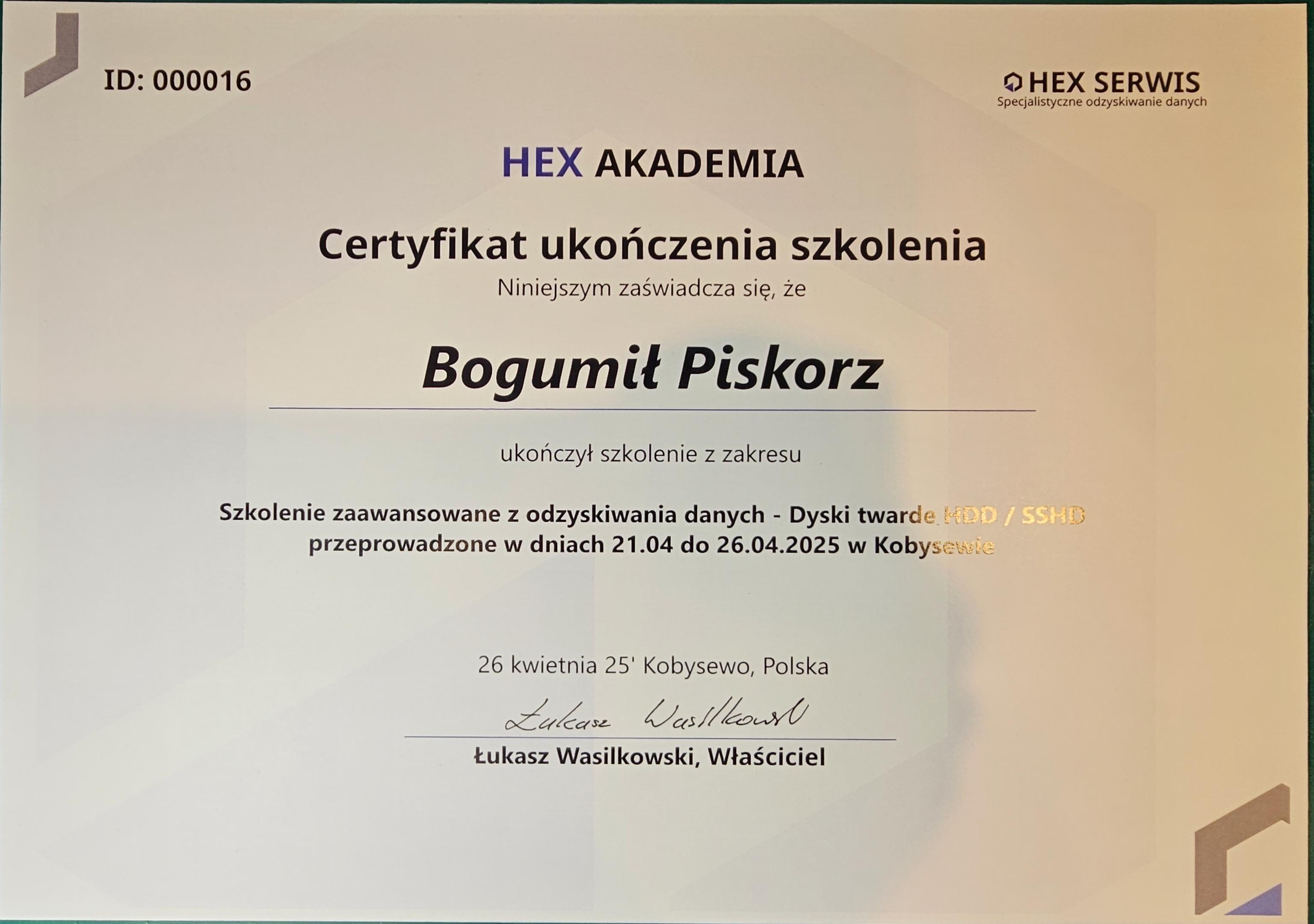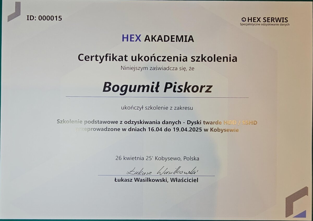 HEX Serwis is a data recovery lab in Poland that also runs training courses. Their curriculum spans from foundational diagnostics to advanced mechanical interventions, including hands-on work with head stack assemblies and platter cleaning.