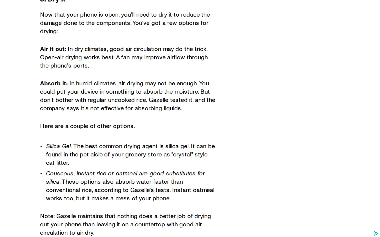 “If you don't have any lying around, uncooked rice will do nicely. Place your phone in an airtight container and completely cover it with your choice of desiccant. Leave the container for 24-48 hours for the material to draw all the moisture out of your handset.”