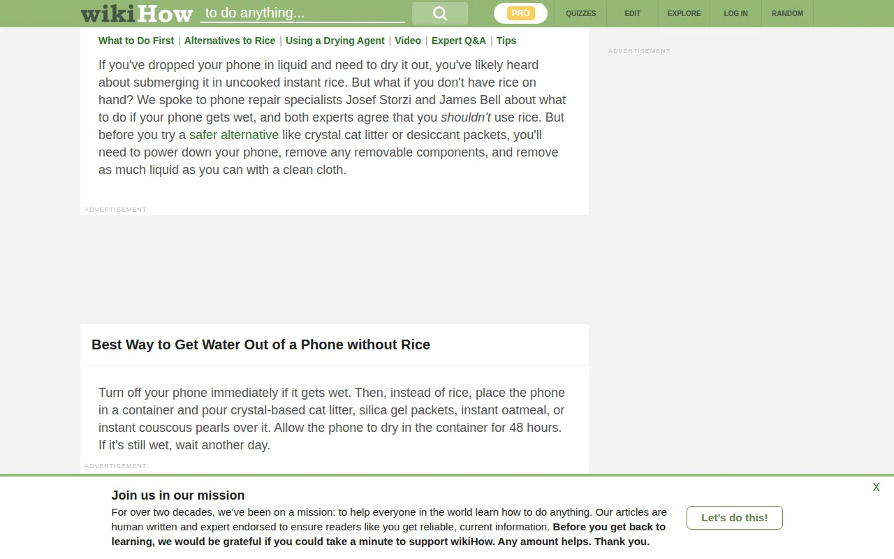 WikiHow instructs users to "place the phone in a container and pour crystal-based cat litter, silica gel packets, instant oatmeal, or instant couscous pearls over it. Allow the phone to dry in the container for 48 hours. If it's still wet, wait another day."