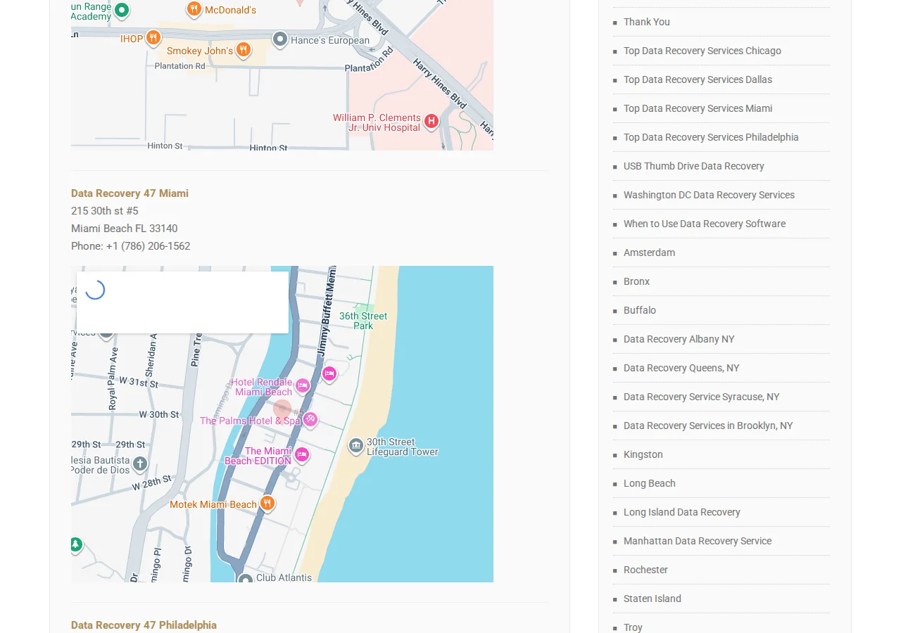 “Data Recovery 47 Miami: 215 30th st #5, Miami Beach FL 33140. Data Recovery 47 Dallas: 1853 West Mockingbird Lane #1201, Dallas Texas 75235. Data Recovery 47 Philadelphia: 1234 Hamilton St #302, Philadelphia, PA 19123.”