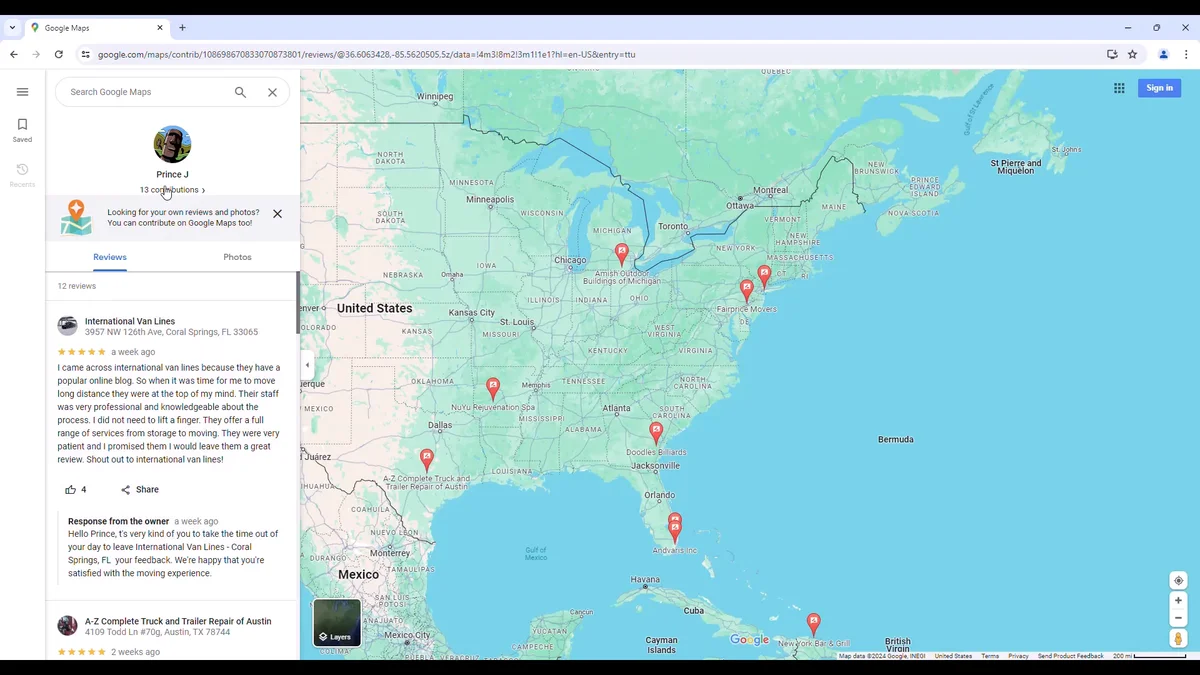 “Prince J reviewed International Van Lines in Florida, a trailer repair shop in Austin, a spa in Hot Springs Arkansas, Amish outdoor buildings in Michigan, spray foam insulation in Alabama, Retail Funding in New York, and Fair Price Movers in Philadelphia. All within a single month.”