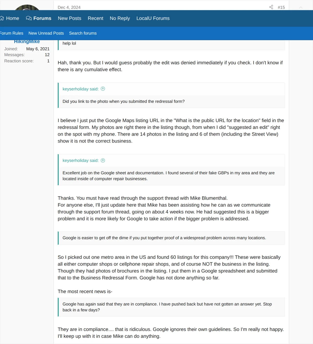 Local Search Forum investigation (HikingMike, Dec 2024)