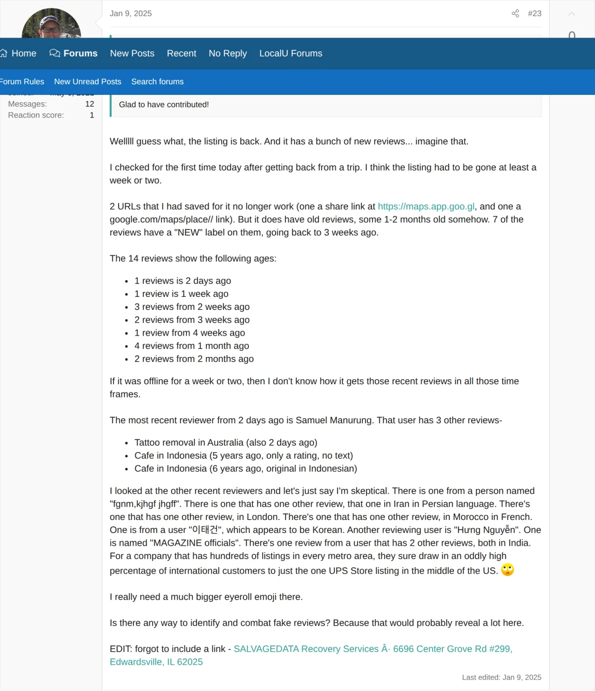 Local Search Forum investigation (HikingMike, Jan 2025)
