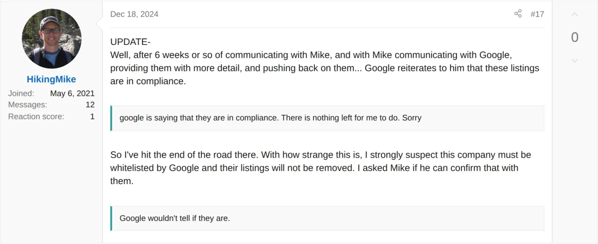 After six weeks of communication through Blumenthal, Google reiterated that the listings were “in compliance.” HikingMike asked whether the company had been whitelisted. Google wouldn't say.